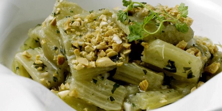 - Pela los tallos del cardo, retirando los hilos. Córtalos en trozos de 4 centímetros y añádelos a la olla.