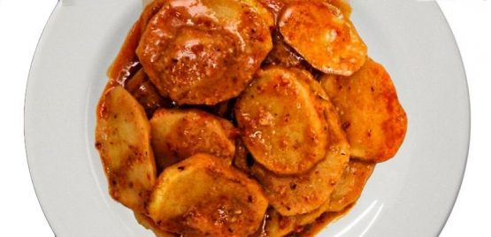 INGREDIENTES: (Para 4 personas) 4 kilos de patatas 4 huevos 250 gramos de cebolla 200 gramos de panceta de cerdo 2 dientes de ajo 30 gramos de almendras tostadas 2 hojas de laurel 2 tomates 1 vaso de aceite 1 vaso de vino blanco 4 pimientos morrones Sal Perejil Azafrán ELABORACIÓN: Se cortan las patatas…