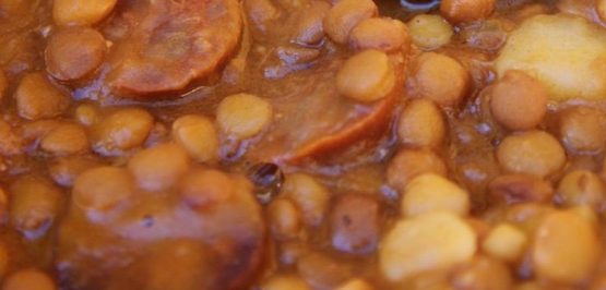 INGREDIENTES: (Para 4 personas) 440 gr. de lentejas 1 hueso de jamón 240 gr. de morcilla 240 gr. de chorizo 160 gr. de champiñones 1 cebolla 1 tomate 2 puerros Una pizca de sal Una cuchara de aceite de oliva Un chorro de vino moscatel Un chorro de anís ELABORACIÓN: Pon a remojo las lentejas…