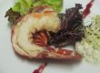 - Terminamos el milhojas coronándolos con las hojas de lechuga, lo regamos todo con la vinagreta y añadimos el cebollino.
